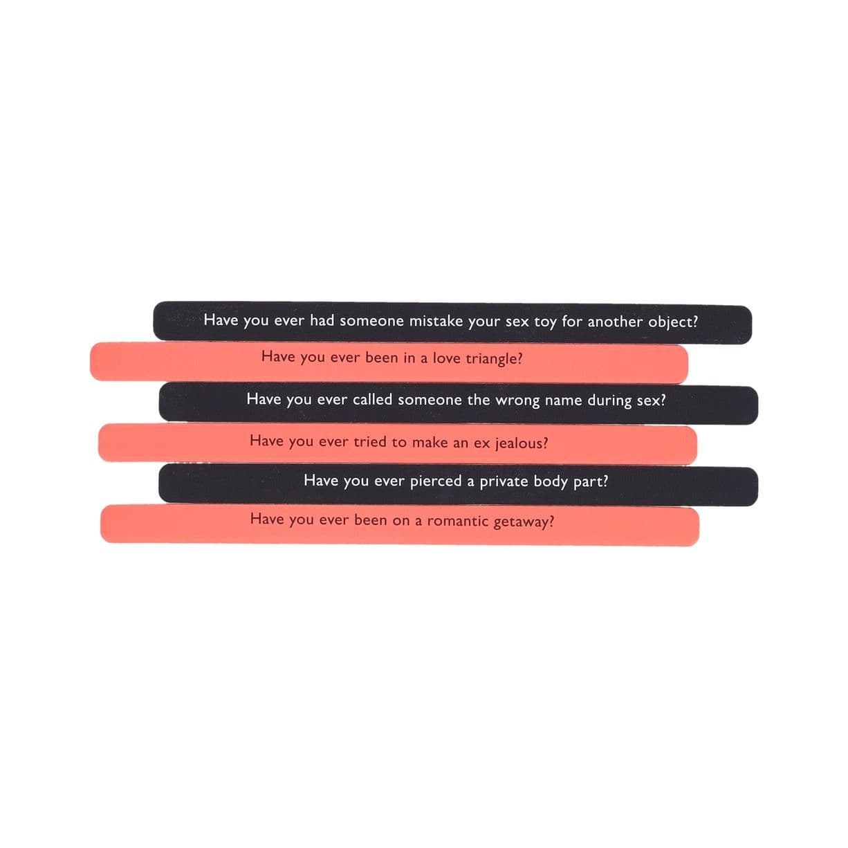 With 100 “have you ever” questions on 50 double-sided sticks, these conversation starters range from benign to risqué. One side of the stick includes sweet, romantic, and funny questions, such as: