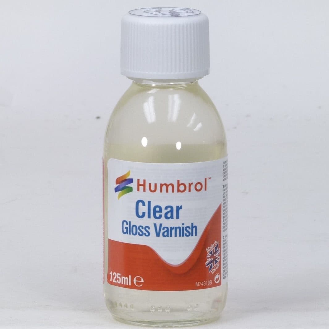 A thin clear varnish that goes on clear and stays clear. Humbrol Clear drys to a low gloss finish, a higher gloss finish can be achieved by applying further thin coats.