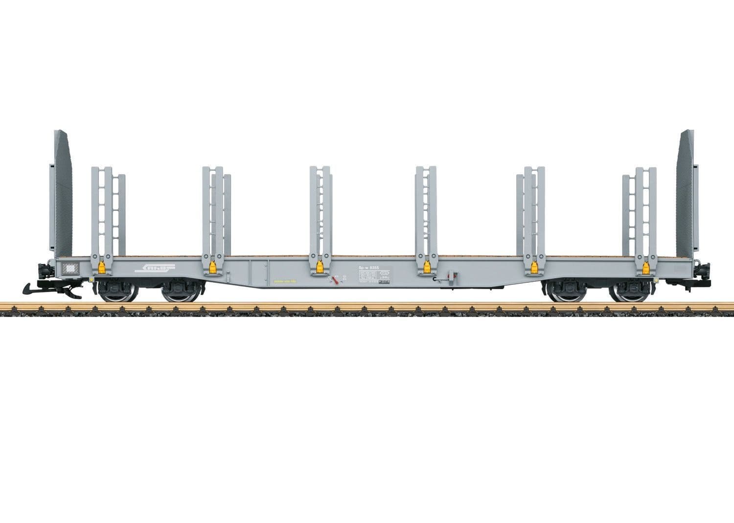 This is a model of an RhB type Sp-w double stake car. The paint scheme and lettering are prototypical for Era VI. The car has high end walls, which serve to secure the load in the prototype. The car does not have a brakeman's platform but does have a hand brake wheel mounted on the side of the car.